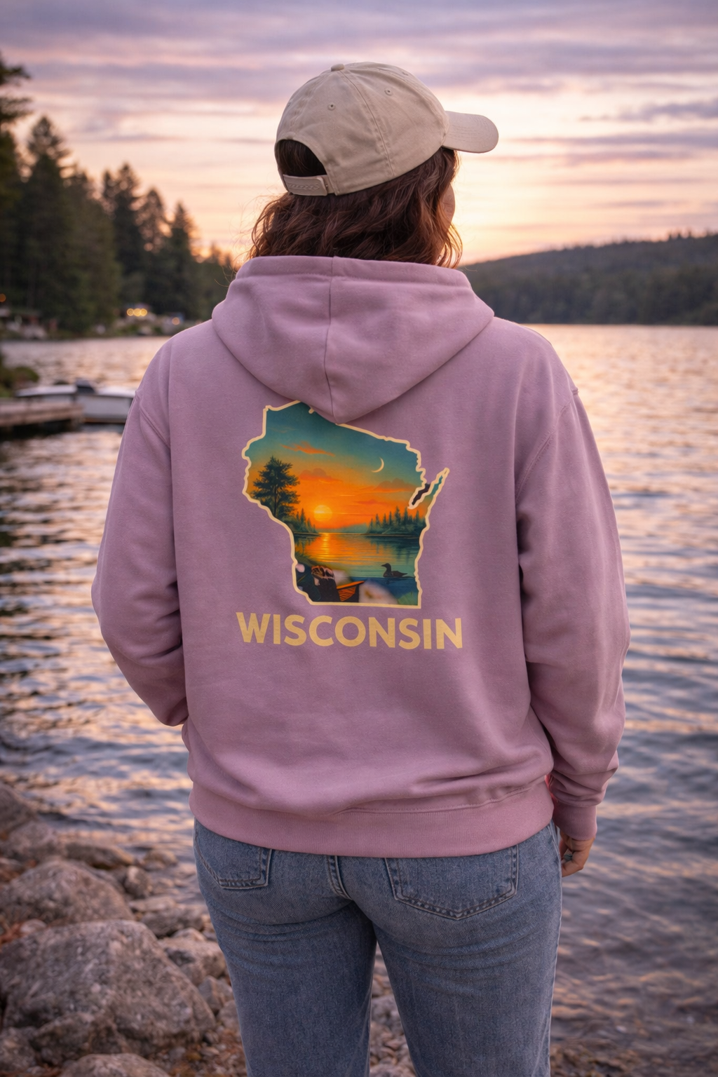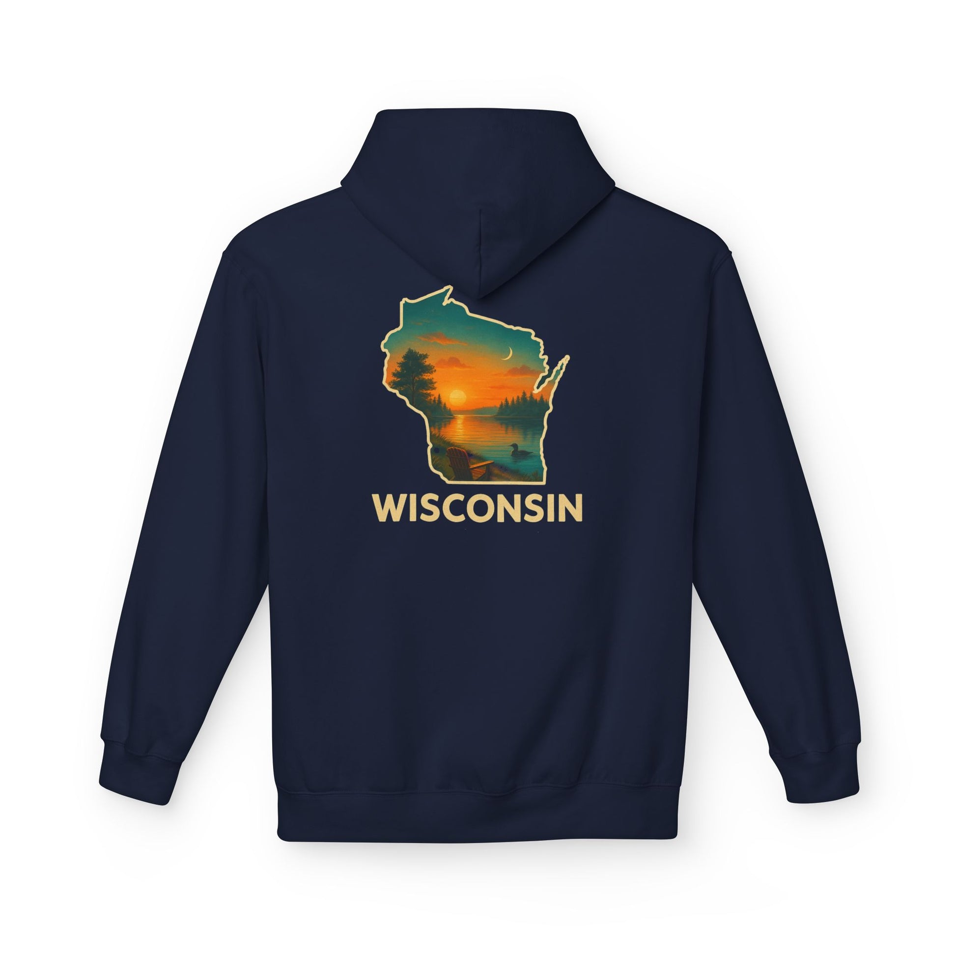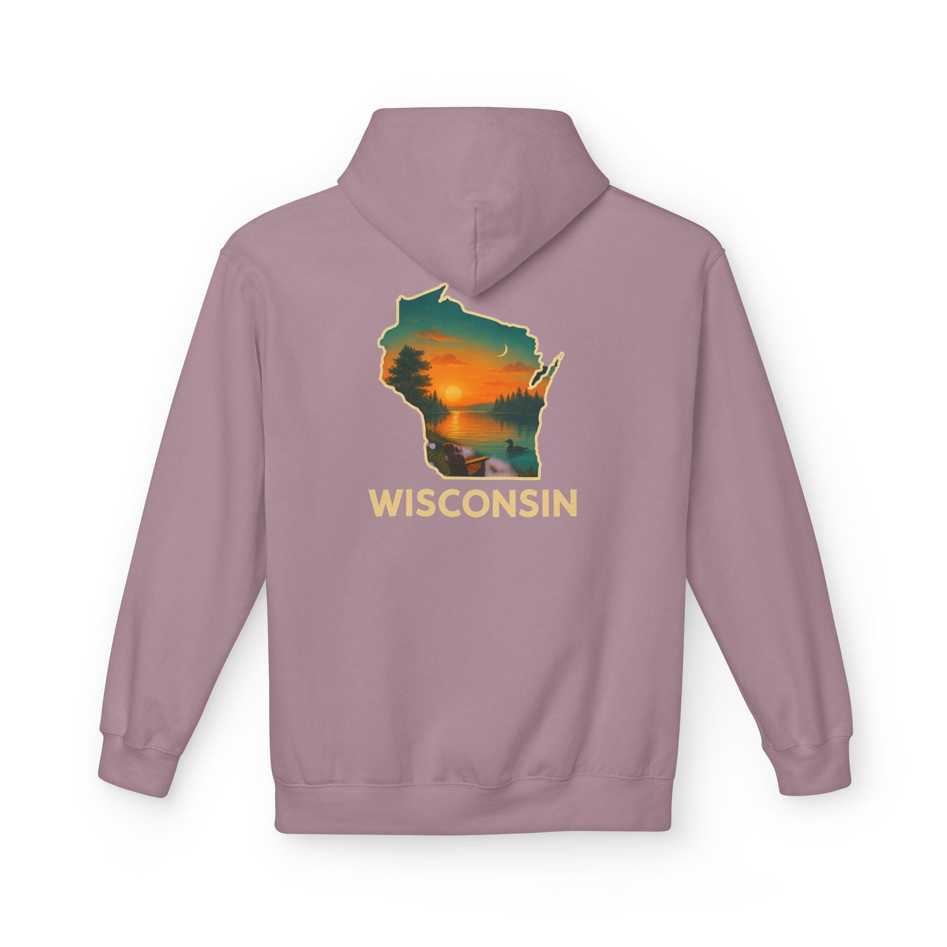 This cozy midweight hoodie carries the quiet pull of Wisconsin lakes and pine-rimmed sunsets. The back shows a soft, painterly Wisconsin silhouette with a layered sunset and treeline — it feels like stepping into an evening on the lake. Wear it after a long hike, at a bonfire, or on slow weekend mornings. The two-piece lined hood and pouch pocket keep hands warm; the dropped shoulders and classic fit let you layer easily without feeling bulky. Sustainably made and OEKO-TEX certified, it’s built to be lived in and passed along.